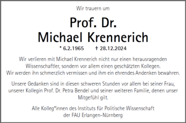 Professor Dr. Michael Krennerich passed away on December 28, 2024 after a long and serious illness surrounded by his family.